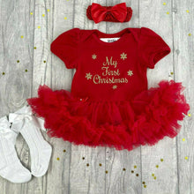 Baby Girls First Christmas, Red Christmas Tutu Romper With Luxury Knee High Socks and Matching Bow Headband, Gold Glitter Design