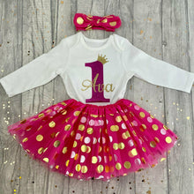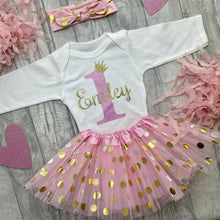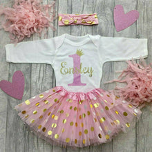 Gorgeous 100% cotton white long sleeve romper featuring your little one's name in gorgeous gold script style text, Glitter '1' and gold princess crown. This romper comes with a stunning polka dot tutu skirt, with an elasticated waist for comfort and ease!