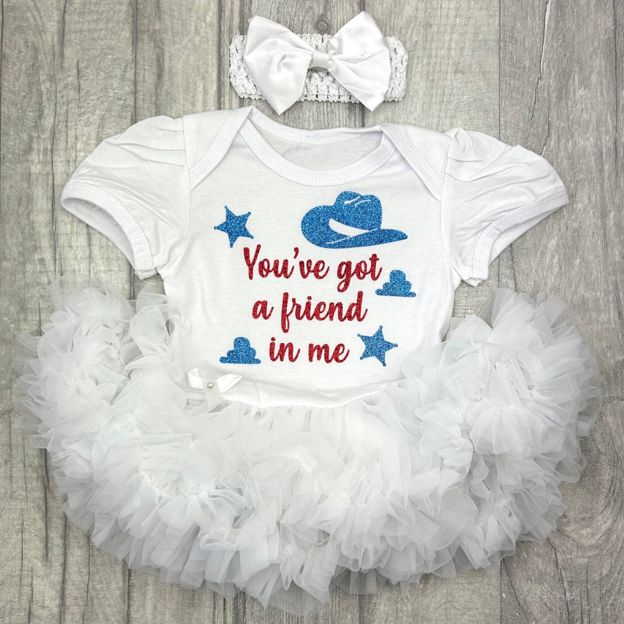 Our 'You've Got A Friend In Me' tutu romper with western stars and cow boy hat is perfect for a little one who loves Toy Story.